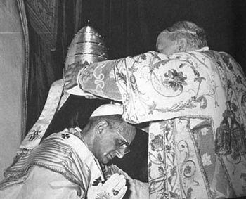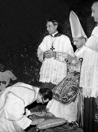 Hoenem kneels and kisses the red slipper of Pope Paul VI